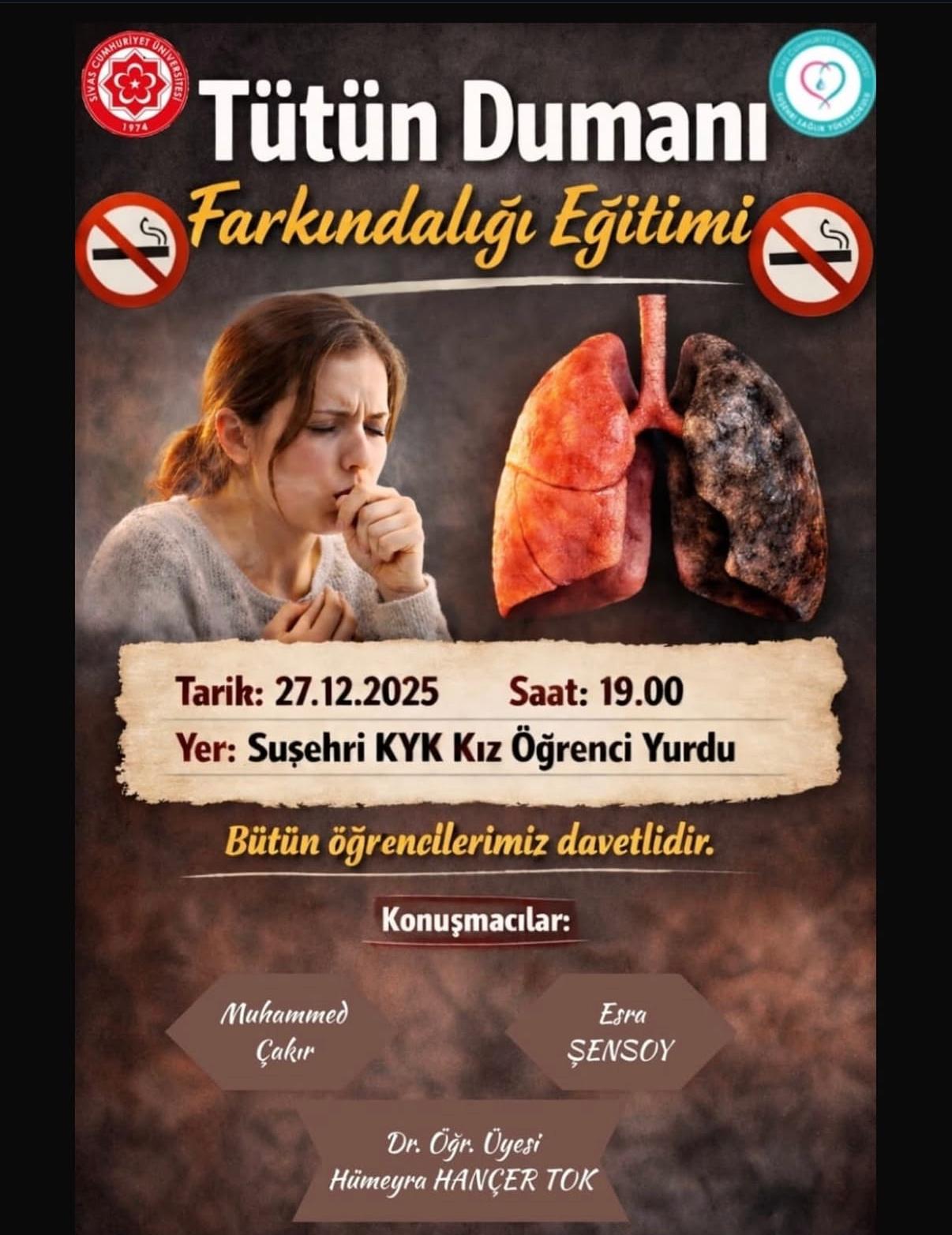 Yüksekokul öğrencilerimiz tarafından Suşehri KYK Kız Öğrenci Yurdunda kalan öğrencilere yönelik Tütün Dumanı Farkındalığı konulu etkinlik düzenlendi