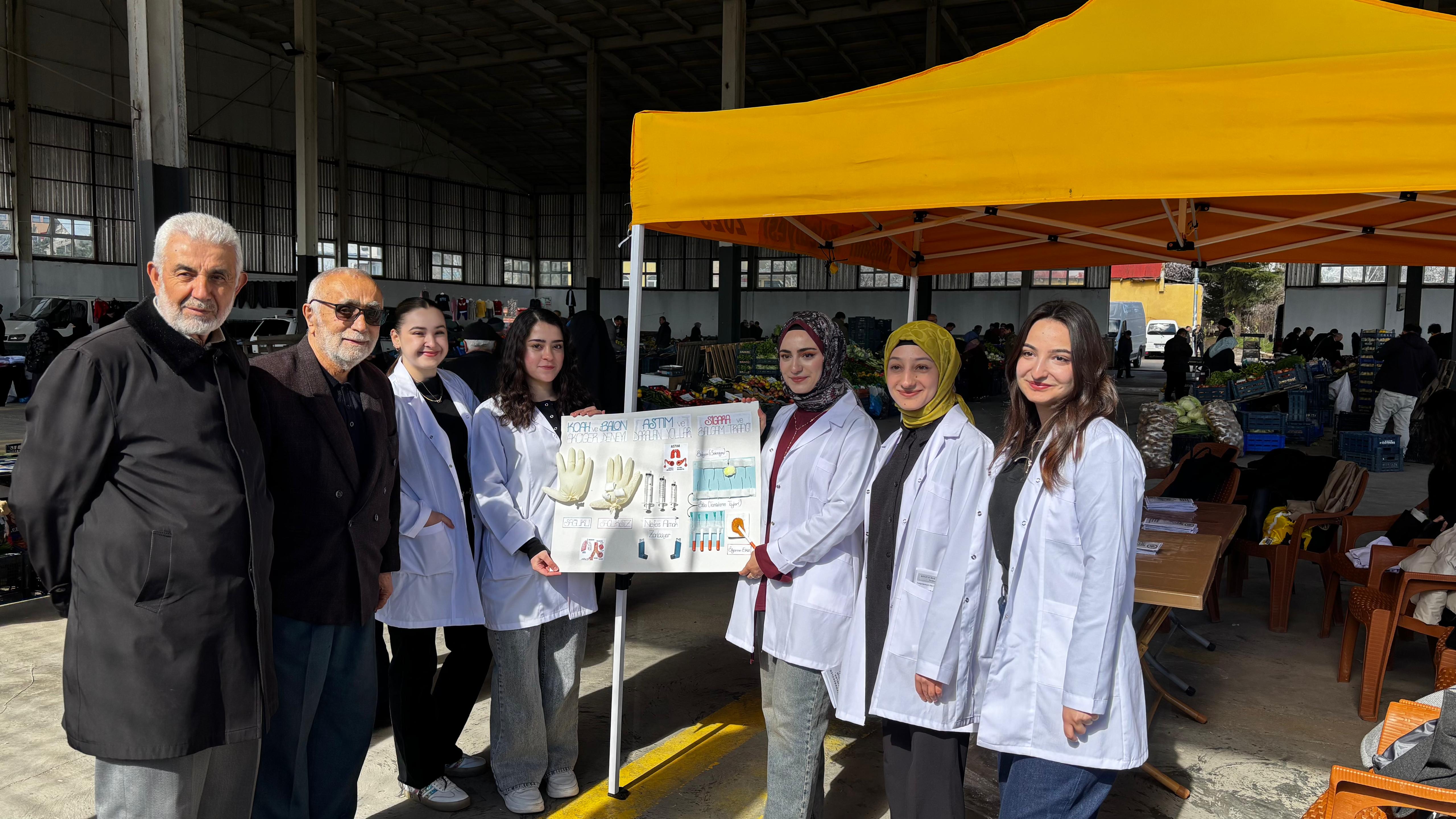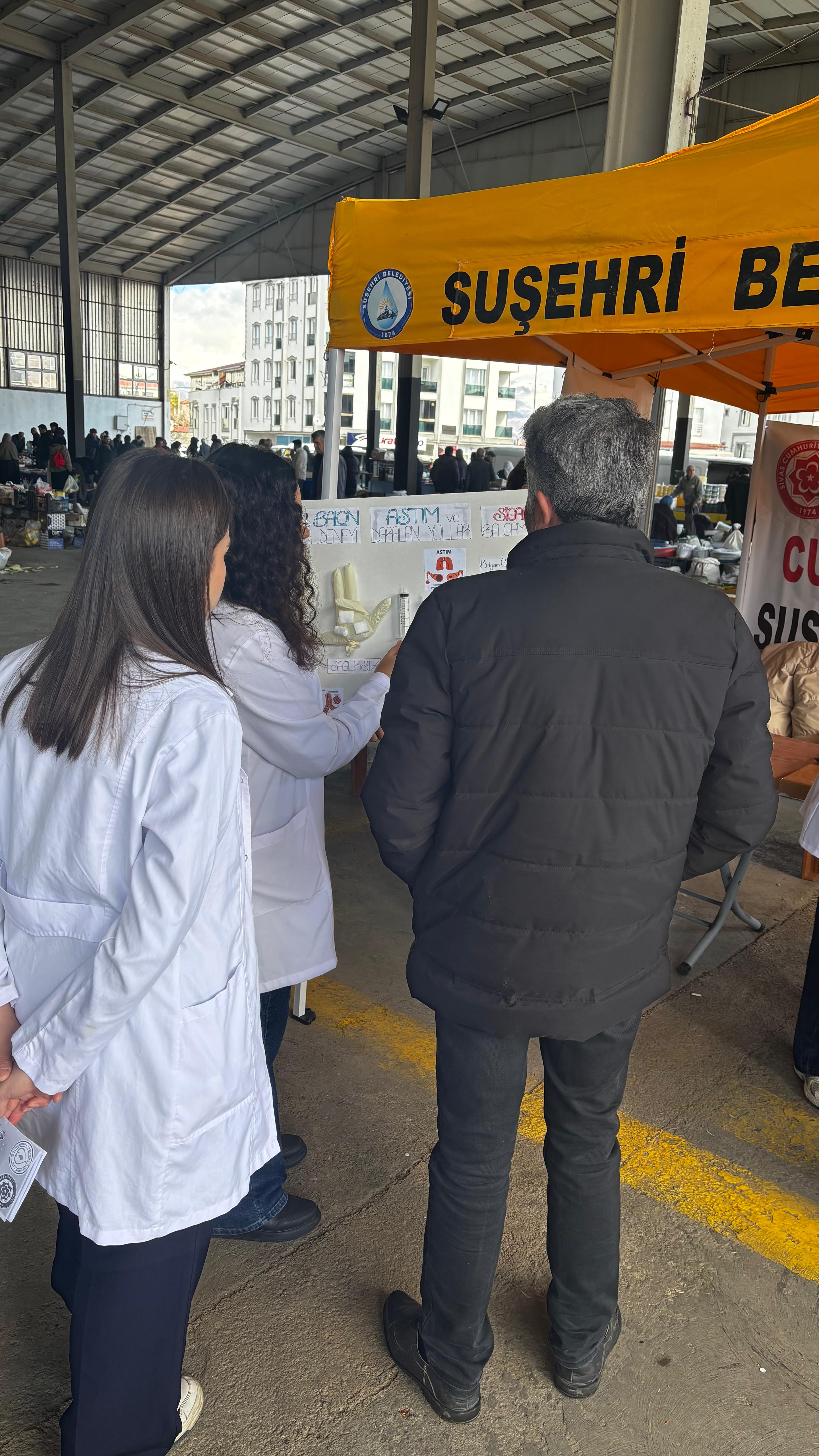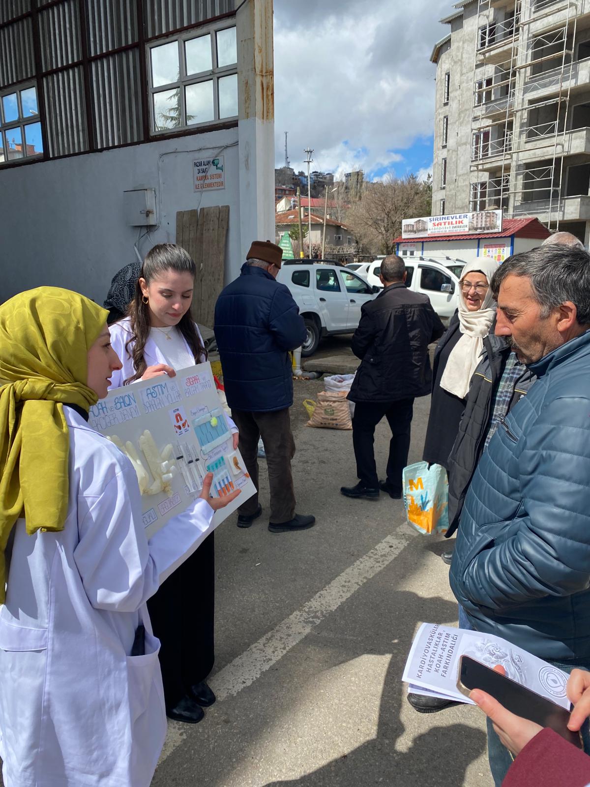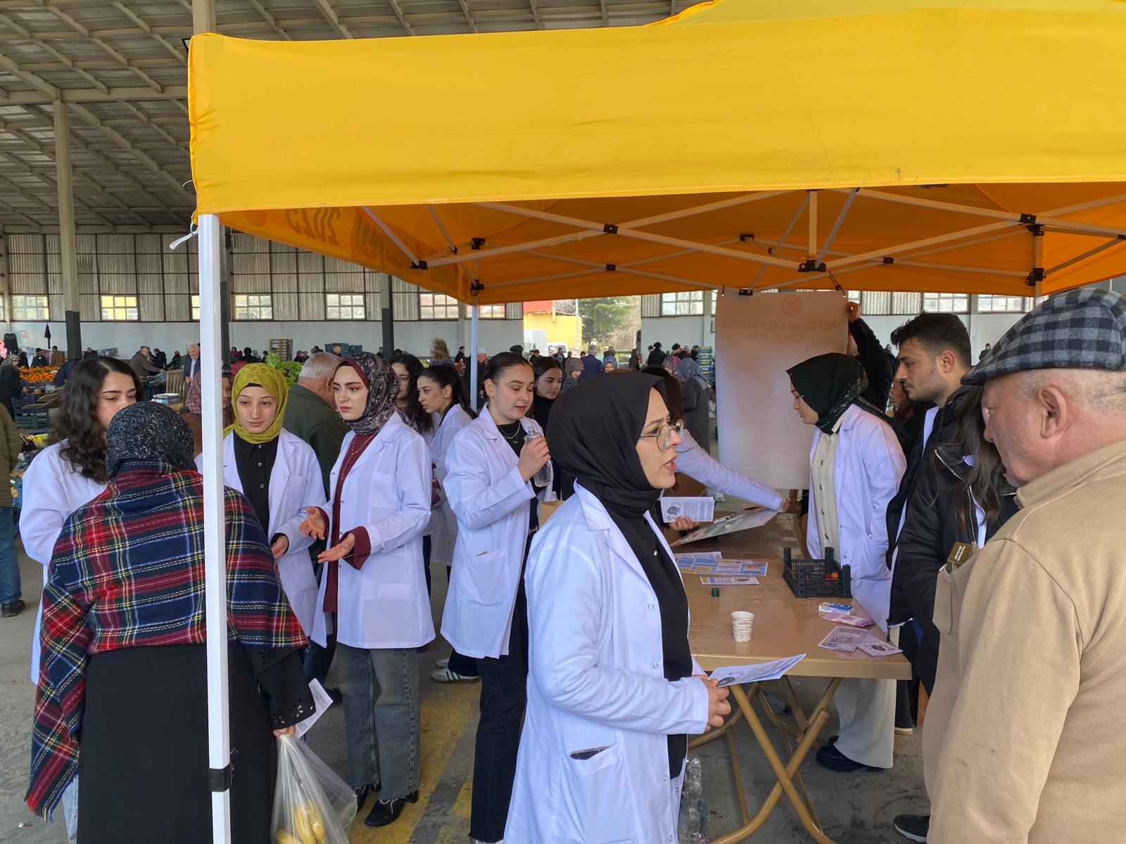 Suşehri Halk Pazarı’nda düzenlenen etkinlikte, hemşirelik öğrencileri akademik danışmanları rehberliğinde vatandaşlarla birebir iletişim kurarak kardiyovasküler hastalıklar, KOAH ve astım konularında bilgilendirme yaptı.