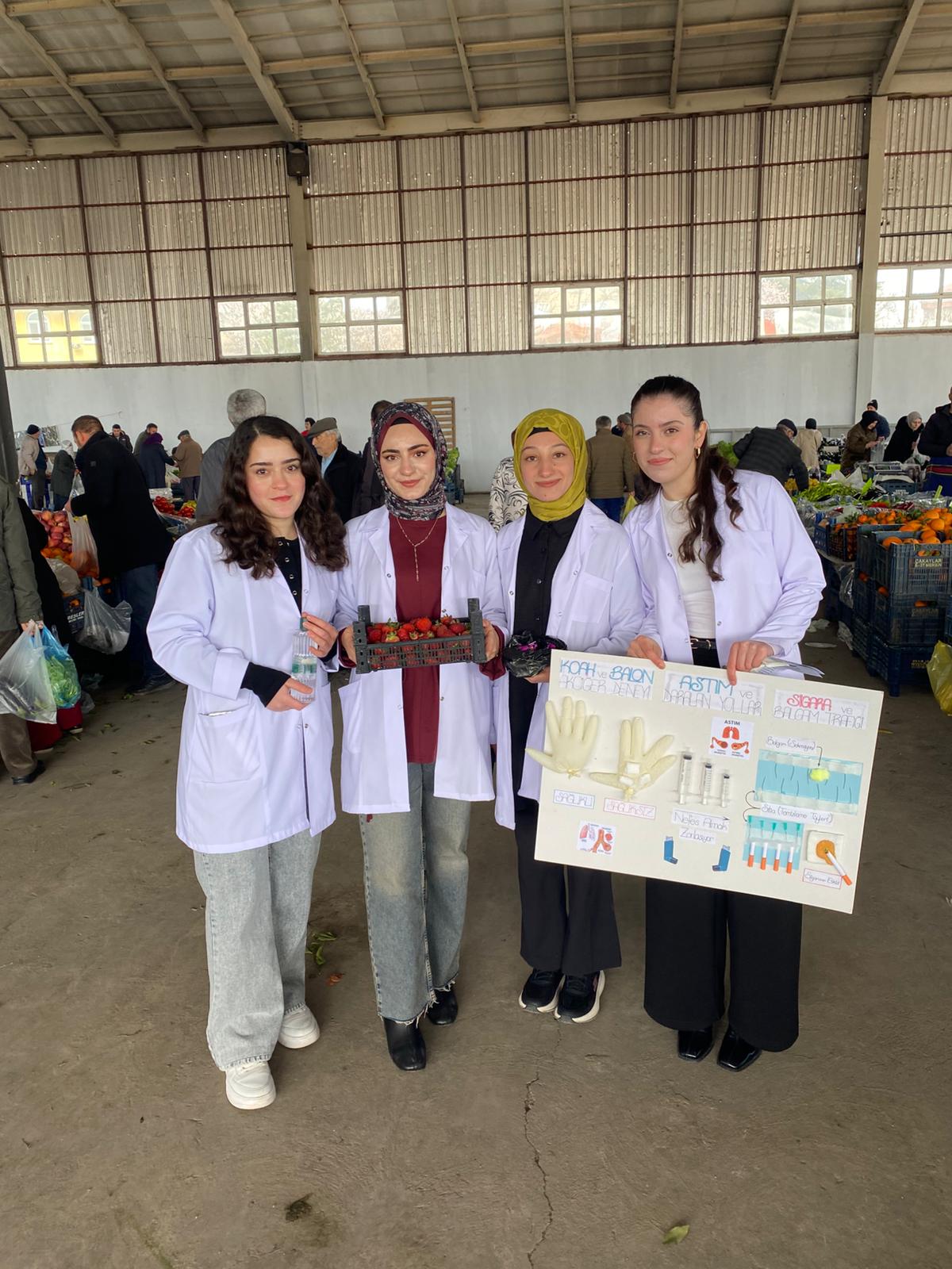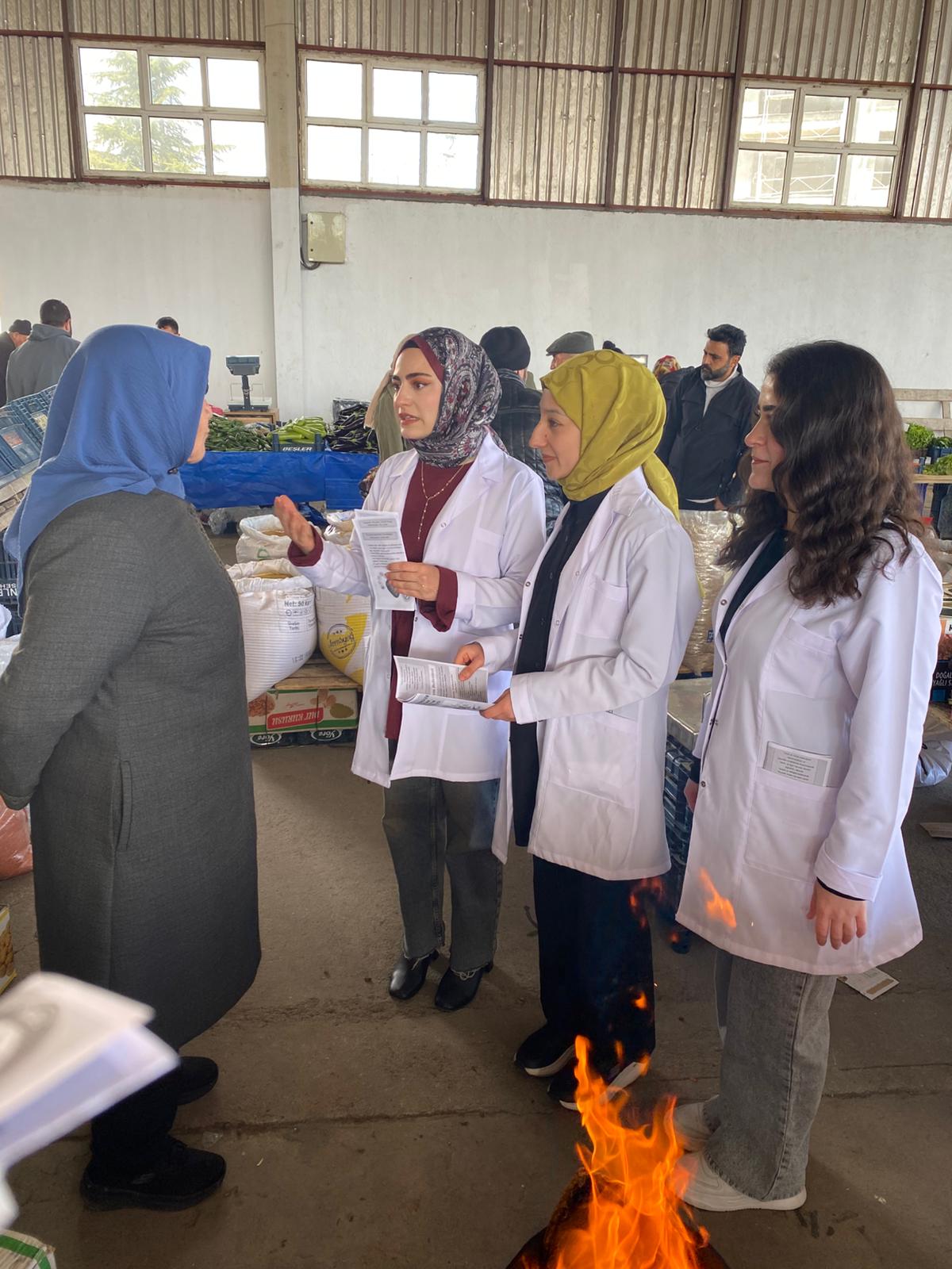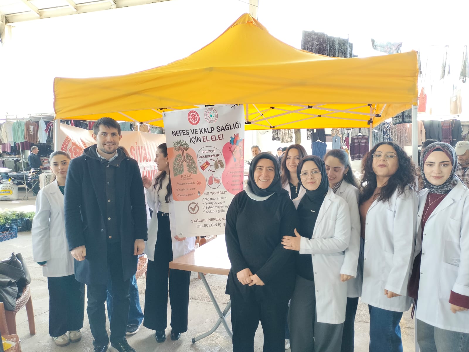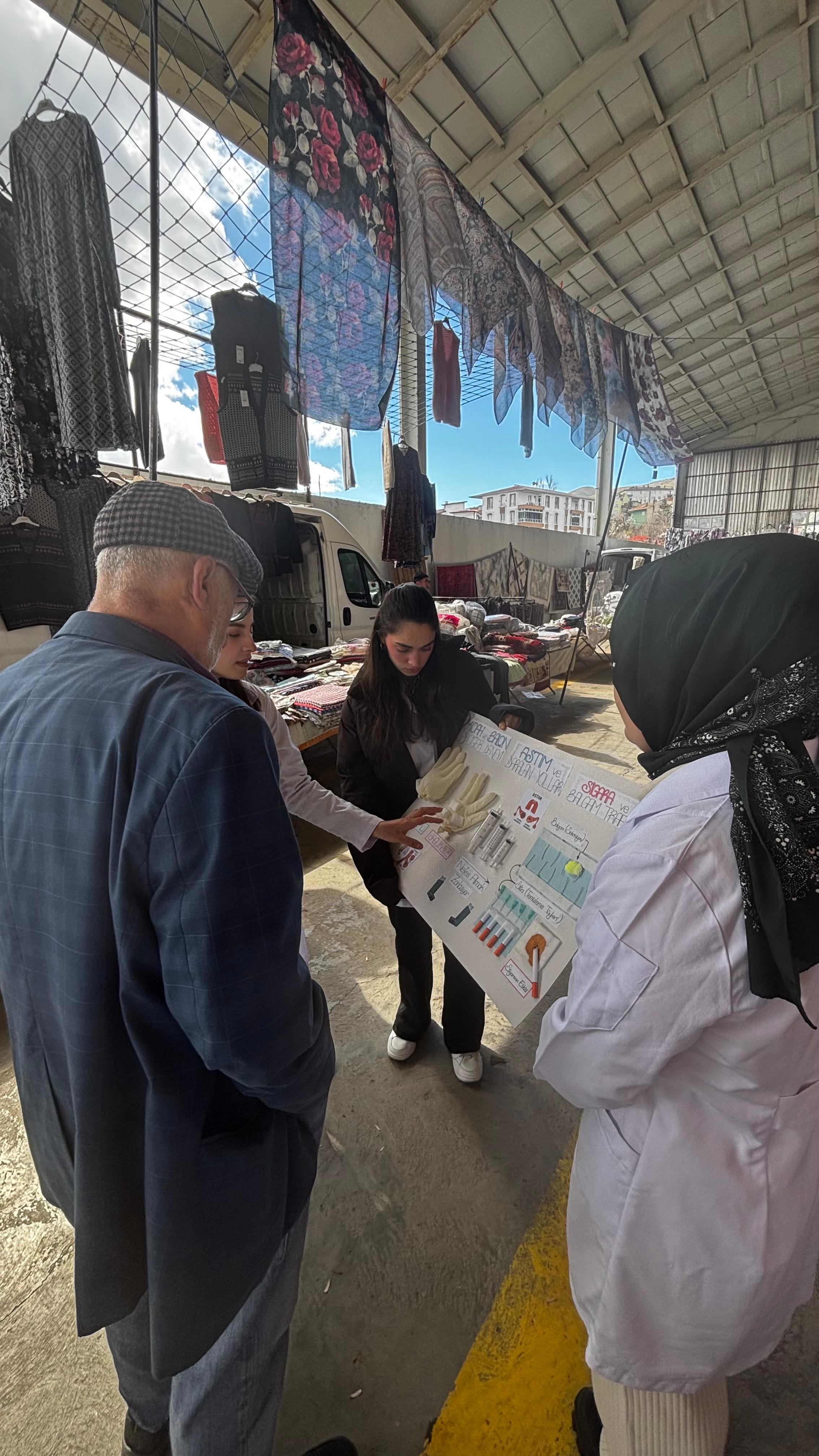 Suşehri Halk Pazarı’nda düzenlenen etkinlikte, hemşirelik öğrencileri akademik danışmanları rehberliğinde vatandaşlarla birebir iletişim kurarak kardiyovasküler hastalıklar, KOAH ve astım konularında bilgilendirme yaptı.