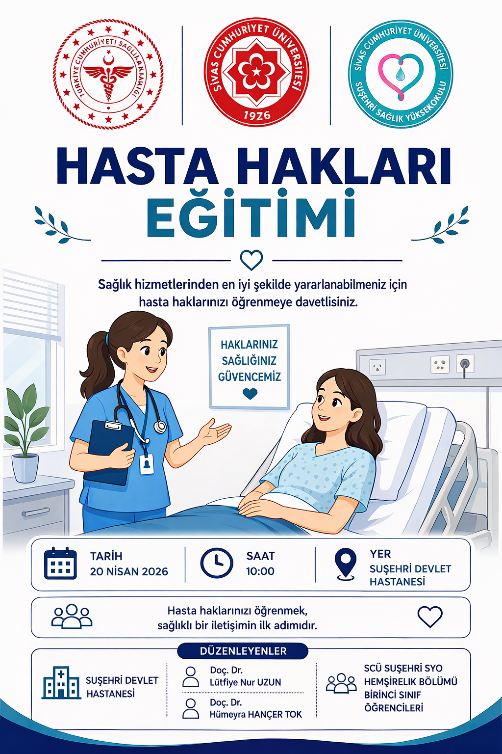 Toplumsal katkı ve sosyal-profesyonel sorumluluk kapsamında, Suşehri Devlet Hastanesi iş birliğiyle hasta ve hasta yakınlarına yönelik “Hasta Hakları Eğitimi” düzenlendi. Eğitim, 20 Nisan 2026 tarihinde saat 10:00’da, Doç. Dr. Lütfiye Nur Uzun ve Doç. Dr. Hümeyra Hançer Tok’un koordinasyonunda, Sivas Cumhuriyet Üniversitesi Suşehri Sağlık Yüksekokulu Hemşirelik Bölümü birinci sınıf öğrencileri tarafından Suşehri Devlet Hastanesi’nde gerçekleştirildi.